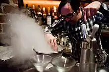 A liquid nitrogen cocktail is any mixed drink whose preparation involves the use of liquid nitrogen.[1][2][3] Popularized as a novelty because of the smoky, bubbling "cauldron effect" it produces, liquid nitrogen is controversial as a cocktail ingredient because it boils at −196 °C (77 K; −321 °F) and its consumption is thus potentially lethal.[3] However, it is not a regulated substance in most countries and there is little control of its use.[4]