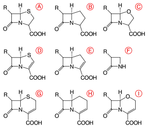 This is a list of common β-lactam antibiotics—both administered drugs and those not in clinical use—organized by structural class. Antibiotics are listed alphabetically within their class or subclass by their nonproprietary name. If an antibiotic is a combination drug, both ingredients will be listed.
