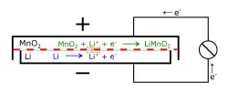 Heat-treated manganese dioxide | Lithium perchlorate in an organic solvent (propylene carbonate and dimethoxyethane in many common cells[14][15][16]) | 3 V | 3.3 V | 280 | 580 |