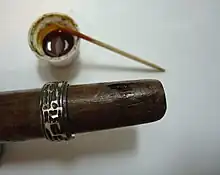 The reactivity of liver of sulfur with silver and copper quickly creates a dark or colored patina on the metal. This is done by immersing the metal object in a solution of liver of sulfur and water. When treating silver, the solution must be hot, though if the bath is brought to its boiling point the liver of sulfur will quickly decompose and become ineffective. Also, if the concentration of the solution is too strong, the oxidation process will proceed too quickly and the layer of patina thus created will tend to flake away. The best results are usually obtained by using more dilute solutions and allowing the patina to build more slowly but more securely, and, for silver, keeping the solution just under its boiling point. Lastly, it is critical that the metal surface be extremely clean, as clean as would be necessary to electroplate the same surface. Even small amounts of oil on the metal such as that produced by handling without gloves will be sufficient to protect the metal surface from oxidation.[2]