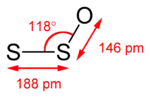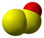 Disulfur monoxide (S2O) is an analogue of sulfur dioxide. Like SO2 as well as ozone (O3), and trisulfur (S3), it adopts a bent structure. The S-S bond length is 188.4 pm, the S-O bond is 146.5 pm and the SSO angle is 117.88°. The two dipole moment components are μa = 0.875 D and μb = 1.18 D.[3] This species decomposes to give a polymeric sulfur oxides ("PSO's") with the approximate formula [S3O]n. PSO's decompose at room temperature to elemental sulfur and SO2. PSO's have been proposed to be responsible for the colour of Io.[4]