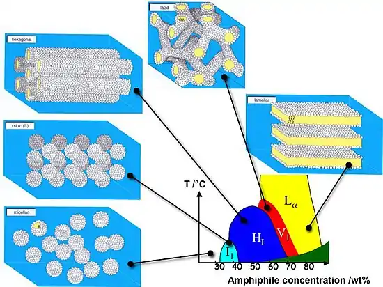 The micro-phase segregation of two incompatible components on a nanometer scale results in different type of solvent-induced extended anisotropic[3] arrangement, depending on the volume balances between the hydrophilic part and hydrophobic part. In turn, they generate the long-range order of the phases, with the solvent molecules filling the space around the compounds to provide fluidity to the system.[4]