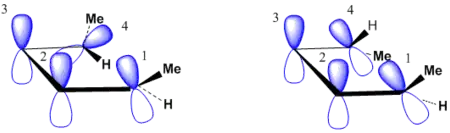 Figure 4 shows the orbital array involved in the butadiene to cyclobutene interconversion. It is seen that there are four orbitals in this cyclic array. Thus in the interconversion reactions orbitals 1 and 4 overlap either in a conrotatory or a disrotatory fashion. Also, it is seen that the conrotation involves one plus–minus overlap as drawn while the disrotation involves zero plus–minus overlaps as drawn. Thus the conrotation uses a Möbius array while the disrotation uses a Hückel array.[3]