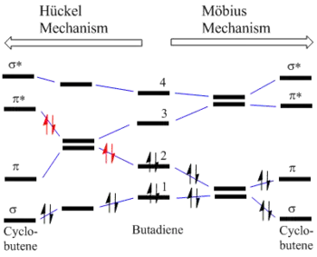 It has been noted that for every degeneracy along a reaction coordinate there is a molecular orbital crossing.[4] Thus for the butadiene to cyclobutene conversion, the two Möbius (here conrotatory) and Hückel (here disrotatory) modes are shown in Figure 5. The starting MOs are depicted in the center of the correlation diagram with blue correlation lines connecting MOs. It is seen that for the Möbius mode the four electrons in MOs 1 and 2 end in the bonding MOs (i.e. σ and π) of cyclobutene. In contrast, for the Hückel mode, there is a degeneracy and thus an MO crossing leading to two electrons (drawn in red) are headed for an antibonding MO. Thus the Hückel mode is forbidden while the Möbius mode is allowed.