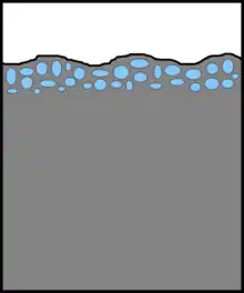 Creaming is the accumulation of drops in the dispersed phase at the top of the container.[2] This occurs as a result of buoyancy forces. The density of the dispersed and continuous phases, as well as the viscosity of the continuous phase, greatly affect the creaming process. If the dispersed phase liquid is less dense than the continuous phase liquid, creaming is more likely to occur. Also, there is a greater chance of creaming at lower viscosities of the continuous phase liquid. Once all of the dispersed drops are in close proximity to each other, it is easier for them to coalesce.