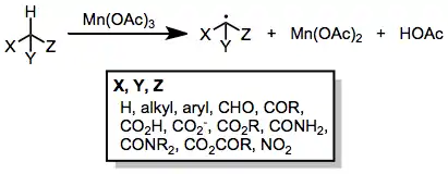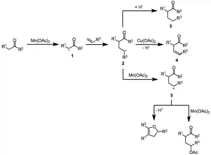 Manganese-mediated coupling reactions are radical coupling reactions between enolizable carbonyl compounds and unsaturated compounds initiated by a manganese(III) salt, typically manganese(III) acetate. Copper(II) acetate is sometimes used as a co-oxidant to assist in the oxidation of intermediate radicals to carbocations.[1]