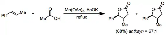 Lactonization of alkenes in the presence of acetic acid and acetate salts is a synthetically useful method for the synthesis of γ-lactones. Selectivity is high for the radical addition that leads to the more stable adduct radical, and trans lactones are selectively formed from either cis or trans acyclic alkenes.[11]