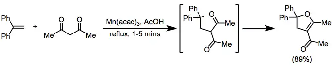 β-Dicarbonyl compounds are useful substrates for the formation of dihydrofurans. Copper(II) acetate is not necessary in this case because of the high resonance stabilization of the intermediate diphenylmethyl radical.[12]