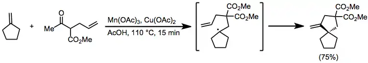 When alkenes or carbonyl compounds containing pendant unsaturated moiety are treated with manganese(III) acetate, tandem intramolecular cyclization reactions may occur. Generally, exo cyclization of terminal double bonds is favored, as shown in equation (10).[13] A variety of substitution patterns may be employed for this transformation, and yields are generally higher than intermolecular coupling reactions.[14]