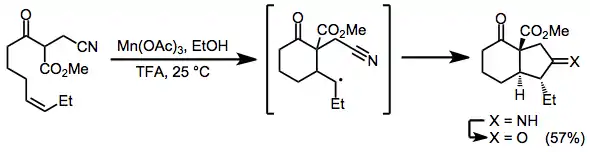 Nitriles are useful as radical acceptors in tandem cyclizations. Hydrolysis of the resulting imine leads to polycyclic ketones in moderate yields with good stereoselectivity.[17]