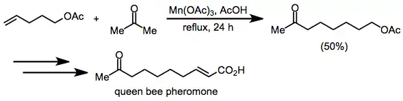 Manganese-mediated couplings have been used for the synthesis of hydrocarbon natural products, such as pheromones. A synthesis of queen bee pheromone uses the intermolecular coupling of acetone and an ω-alkenyl acetate en route to the target.[18]