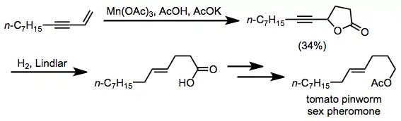 Lactonization is a key step in the synthesis of tomato pinworm sex pheromone. Subsequent Lindlar hydrogenation, reduction and acetylation provided the target compound.[19]