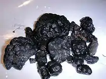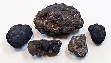 Polymetallic nodules, also called manganese nodules, are mineral concretions on the sea bottom formed of concentric layers of iron and manganese hydroxides around a core. As nodules can be found in vast quantities, and contain valuable metals, deposits have been identified as a potential economic interest.[1] Depending on their composition and autorial choice, they may also be called ferromanganese nodules. Ferromanganese nodules are mineral concretions composed of silicates and insoluble iron and manganese oxides that form on the ocean seafloor and terrestrial soils. The formation mechanism involves a series of redox oscillations driven by both abiotic and biotic processes.[2] As a byproduct of pedogenesis, the specific composition of a ferromanganese nodule depends on the composition of the surrounding soil.[2] The formation mechanisms and composition of the nodules allow for couplings with biogeochemical cycles beyond iron and manganese.[2] The high relative abundance of nickel, copper, manganese, and other rare metals in nodules has increased interest in their use as a mining resource.[3][4]