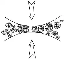 During high-energy milling the powder particles are repeatedly flattened, cold welded, fractured and rewelded. Whenever two steel balls collide, some powder is trapped between them. Typically, around 1000 particles with an aggregate weight of about 0.2 mg are trapped during each collision. The force of the impact plastically deforms the powder particles, leading to work hardening and fracture. The new surfaces thus created enable the particles to weld together; this leads to an increase in particle size. Since in the early stages of milling, the particles are soft (if using either ductile-ductile or ductile-brittle material combination), their tendency to weld together and form large particles is high. A broad range of particle sizes develops, with some as large as three times larger than the starting particles. The composite particles at this stage have a characteristic layered structure consisting of various combinations of the starting constituents. With continued deformation particles become work hardened, and fracture by a fatigue failure mechanism and/or by the fragmentation of fragile flakes.