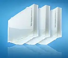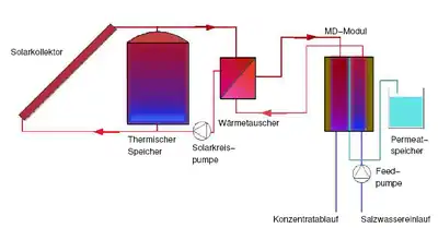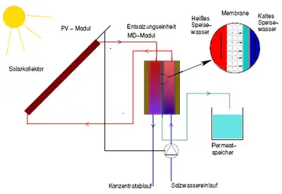 Membrane distillation is very suitable for compact, solar powered desalination units providing small and medium range output less than 10,000 litres per day (2,600 US gal/d).[23] Especially the spiral wound design patented by GORE in the year 1985 suits this application. Within the MEMDIS project, which kicked off in 2003, the Fraunhofer Institute for Solar Energy Systems ISE began developing MD modules as well as installing and analysing two different solar powered operating systems, together with other project partners. The first system type is a so-called compact system, designed to produce a drinking water output of 100–120 litres per day (26–32 US gal/d) from sea-or brackish water. The main aim of the system design is a simple, self-sufficient, low maintenance and robust plant for target markets in arid and semi-arid areas of low infrastructure. The second system type is a so-called two-loop plant with a capacity of around 2,000 litres per day (530 US gal/d). Here, the collector circuit is separated from the desalination circuit by a saltwater resistant heat exchanger.[7] Based on these two system types, a various number of prototypes were developed, installed and observed.