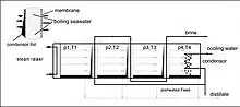The typical vacuum multi-effect membrane distillation (e.g. the memsys brand V-MEMD) module consists of a steam raiser, evaporation–condensation stages, and a condenser. Each stage recovers the heat of condensation, providing a multiple-effect design. Distillate is produced in each evaporation–condensation stage and in the condenser.[22]