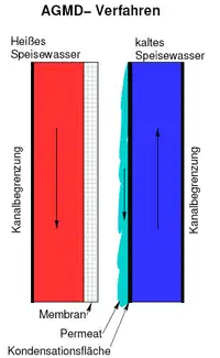 In air-gap MD, the evaporator channel resembles that in DCMD, whereas the permeate gap lies between the membrane and a cooled walling and is filled with air. The vapour passing through the membrane must additionally overcome this air gap before condensing on the cooler surface. The advantage of this method is the high thermal insulation towards the condenser channel, thus minimizing heat conduction losses. However, the disadvantage is that the air gap represents an additional barrier for mass transport, reducing the surface- related permeate output compared to DCMD.[12] A further advantage over DCMD is that volatile substances with a low surface tension such as alcohol or other solvents can be separated from diluted solutions, due to the fact that there is no contact between the liquid permeate and the membrane with AGMD. AGMD is especially advantageous compared to alternatives at higher salinity.[13] Variations on AGMD can include hydrophobic condensing surfaces[14] or porous condensers[15] for improved flux and energy efficiency. In AGMD, uniquely important design features include gap thickness, condensing surface hydrophobicity, gap spacer design, and tilt angle.[16]