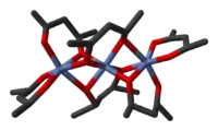 Nickel(II) bis(acetylacetonate) exists as the trimetallic complex [Ni(acac)2]3. Bulky beta-diketonates give red, monomeric, square-planar complexes.[23] Nickel(II) bis(acetylacetonate) reacts with water to give the octahedral[24] adduct [Ni(acac)2(H2O)2], a chalky green solid.