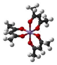 Chromium(III) acetylacetonate, Cr(acac)3, is a typical octahedral complex containing three acac− ligands. Like most such compounds, it is highly soluble in nonpolar organic solvents. This particular complex, which has a three unpaired electrons, is used as a spin relaxation agent to improve the sensitivity in quantitative carbon-13 NMR spectroscopy.[8] Chromium(II) acetylacetonate is a highly oxygen-sensitive, light brown compound. The complex adopts a square planar structure, weakly associated into stacks in the solid state. It is isomorphous with Pd(acac)2 and Cu(acac)2.[9]