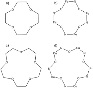 Metallacrown nomenclature has been developed to mimic the nomenclature of crown ethers, which are named by the total number of atoms in the ring, followed by "C" for "crown," and the number of oxygen atoms in the ring. For example, 12-crown-4 or 12-C-4 describes Figure 2a. When naming metallacrowns, a similar format is followed. However, the C becomes "MC" for "metallacrown" and the "MC" is followed by the ring metal, other heteroatom, and the ligand used to make the metallacrown. For example, metallacrown b in the figure above is named [12-MCFe(III)N(shi)-4], where "shi" is the ligand, salicylhydroxamic acid.[2]