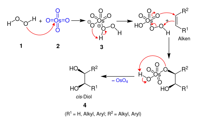 The proposed mechanism for the Milas hydroxylation involves the initial combination of hydrogen peroxide and the osmium tetroxide catalyst to form an intermediate, which then adds to the alkene, followed by a cleavage that forms the product and regenerates the OsO4.[2]