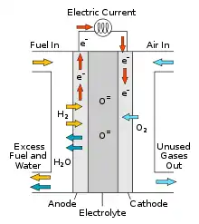 - Anode Reaction: 2H2 + 2O2− → 2H2O + 4e−