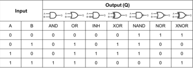 AND, OR, XOR, NAND, NOR, XNOR, and INH are two-input logic gates. The AND, OR, and XOR gates are fundamental logic gates, and the NAND, NOR, and XNOR gates are complementary to AND, OR, and XOR gates, respectively. An INHIBIT (INH) gate is a special conditional logic gate that includes a prohibitory input. When the prohibitory input is absent, the output produced depends solely on the other input.