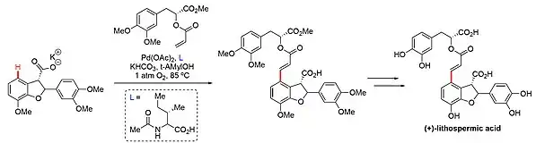 - Wang, Dong-Hui; Yu, Jin-Quan (2011-04-20). "Highly Convergent Total Synthesis of (+)-Lithospermic Acid via a Late-Stage Intermolecular C−H Olefination". Journal of the American Chemical Society. 133 (15): 5767–5769. doi:10.1021/ja2010225. ISSN 0002-7863. PMC 3085405. PMID 21443224.