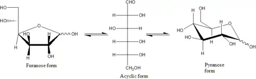 Conversion between the furanose, acyclic, and pyranose forms of D-glucose