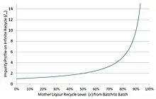 An alternative to second cropping is continuous recycle of a portion of the mother liquors from one batch into in subsequent batches in which an increased product yield is expected, and also leads to an accumulation of impurities. It can be shown that the impurity profile of the mother liquors, at moderate recycle levels (i.e. when x>1), quickly reaches a steady state according to (1 − xn +1)/(1 − x), where n is the number of times the process is operated and x is the fraction of mother liquors recycled (Fig. 1).[3] The aforementioned approach is idealised and assumes that the build up of impurities in the mother liquor does not exceed the impurity/impurities solubility. The approach has been confirmed experimentally.[4]