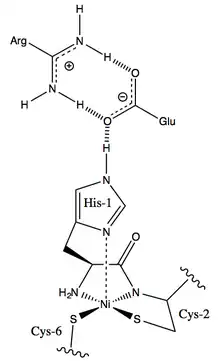 Cofactor F430 contains nickel in a tetrapyrrole derivative, and is used in the production of methane. Some hydrogenase enzymes contain a nickel-iron cluster as an active site in which the nickel atom is held in place by cysteine or selenocysteine.[54] Plant ureases contain a bis-μ-hydroxo dimeric nickel cluster.[55] CO-methylating acetyl-CoA synthase contains two active nickel atoms, one is held in a square planar coordination by two cysteine and two amide groups, and the other nickel is held by three sulfur atoms. It is used to catalyse the reduction of carbon monoxide to acetyl-CoA.[56]