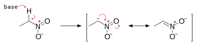A nitronate (IUPAC: azinate) in organic chemistry is an anion with the general structure R1R2C=N+(−O−)2, containing the =N+(−O−)2 functional group,[1][2] where R can be hydrogen, halogen, organyl group or other groups. It is the anion of nitronic acid R1R2C=N+(−O−)−OH (sometimes also called an aci-nitro compound,[3] or an azinic acid[4]), a tautomeric form of a nitro compound. Just as aldehydes and ketones can exist in equilibrium with their enol tautomer, nitro compounds exist in equilibrium with their nitronate tautomer under basic conditions. In practice they are formed by the deprotonation of the α-carbon, the pKa of which is typically around 17.