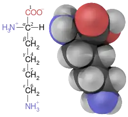 In addition to the IUPAC numbering system to differentiate the various carbons in an organic molecule, by sequentially assigning a number to each carbon, including those forming a carboxylic group, the carbons along the side-chain of amino acids can also be labelled with Greek letters, where the α-carbon is the central chiral carbon possessing a carboxyl group, a side chain and, in α-amino acids, an amino group – the carbon in carboxylic groups is not counted.[8] (Consequently, the IUPAC names of many non-proteinogenic α-amino acids start with 2-amino- and end in -ic acid.)