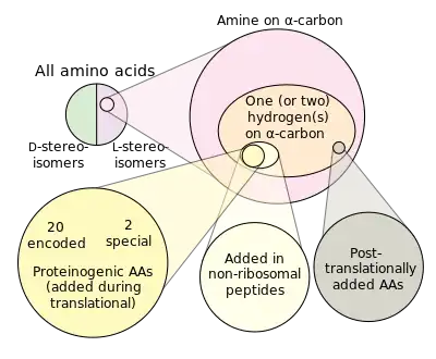 In biochemistry, non-coded or non-proteinogenic amino acids are distinct from the 22 proteinogenic amino acids (21 in eukaryotes[note 1]), which are naturally encoded in the genome of organisms for the assembly of proteins. However, over 140 non-proteinogenic amino acids occur naturally in proteins and thousands more may occur in nature or be synthesized in the laboratory.[1] Chemically synthesized amino acids can be called unnatural amino acids. Unnatural amino acids can be synthetically prepared from their native analogs via modifications such as amine alkylation, side chain substitution, structural bond extension cyclization, and isosteric replacements within the amino acid backbone.[2] Many non-proteinogenic amino acids are important: