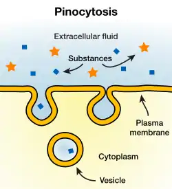 In humans, this process occurs primarily for absorption of fat droplets. In endocytosis the cell plasma membrane extends and folds around desired extracellular material, forming a pouch that pinches off creating an internalized vesicle. The invaginated pinocytosis vesicles are much smaller than those generated by phagocytosis. The vesicles eventually fuse with the lysosome, whereupon the vesicle contents are digested.[1] Pinocytosis involves a considerable investment of cellular energy in the form of ATP.[1]