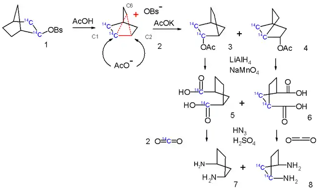 Radioactive isotope labeling experiments provide a powerful tool for determining the structure of organic molecules. By systematically decomposing the 2-norbornyl cation and analyzing the amount of radioactive isotope in each decomposition product, researchers were able to show further evidence for the non-classical picture of delocalized bonding (see Figure 9). Proponents of the nonclassical picture would expect 50% of the generated CO2 in the decomposition in Figure 9 to contain 14C, while proponents of the classical picture would expect more of the generated CO2 to be radioactive due to the short-lived nature of the cation. 40% of the carbon dioxide produced via decomposition has been observed to be radioactive, suggesting that the non-classical picture is more correct.[14]