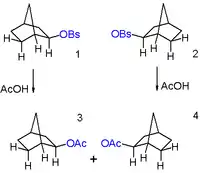 For example, the major product of the acetolysis of β-(Δ3-cyclopentenyl)-ethyl nosylate (p-nitrobenzenesulfonate) is 2-exo-norbornyl acetate. The dearth of β-(Δ3-cyclopentenyl)-ethyl acetate present after the reaction is explained by the greater stability of the norbornyl system over the decorated cyclopentenyl system.[8]