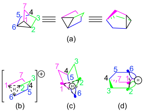 - Olah, G. A.; Commeyras, A.; Lui, C. Y. (1968). "Stable carbonium ions. LXXII. Raman and N.M.R. Spectroscopic study of the nortricyclonium ion [protonated tricyclo[2.2.1.02,6]heptane] and its relation to the 2-norbornyl [bicyclo[2.2.1]heptyl] cation. The nature of the stable long-lived norbornyl cation in strong acid solutions". Journal of the American Chemical Society. 90 (14): 3882. doi:10.1021/ja01016a062.