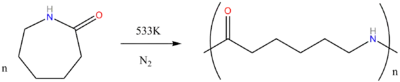 Nylon 6 can be modified using comonomers or stabilizers during polymerization to introduce new chain end or functional groups, which changes the reactivity and chemical properties. It is often done to change its dyeability or flame retardance.[3] Nylon 6 is synthesized by ring-opening polymerization of caprolactam. Caprolactam has 6 carbons, hence Nylon 6. When caprolactam is heated at about 533 K in an inert atmosphere of nitrogen for about 4–5 hours, the ring breaks and undergoes polymerization. Then the molten mass is passed through spinnerets to form fibres of nylon 6.