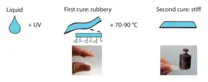 The OSTE+ resins are first UV-cured in the same way as the OSTE-polymers but are later thermally cured to stiffen and bond to a substrate.