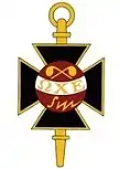 The society's badge is a black Maltese cross background, on which is superimposed a circular maroon crest. The crest bears the letters ΩΧΕ on a white band passing across the horizontal midline. Above the white band are two crossed retorts rendered in gold. Below the white band are a gold integral sign and a lightning bolt. These symbols are noted to represent the roles of chemistry, mathematics, and physics in chemical engineering.[2]