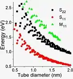 - Optical transitions occur between the v1 − c1, v2 − c2, etc., states of semiconducting or metallic nanotubes and are traditionally labeled as S11, S22, M11, etc., or, if the "conductivity" of the tube is unknown or unimportant, as E11, E22, etc. Crossover transitions c1 − v2, c2 − v1, etc., are dipole-forbidden and thus are extremely weak, but they were possibly observed using cross-polarized optical geometry.[9]