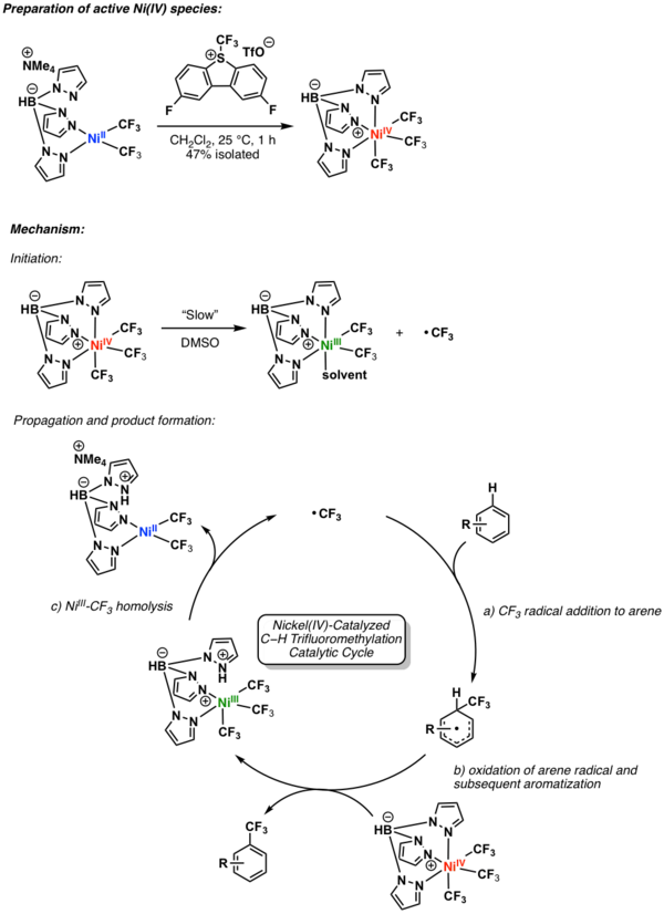A catalytic variant was reported by Sanford and coworkers in 2019. The mechanism for this transformation is shown in the following scheme. Here, the key NiIV intermediate undergoes a slow homolysis to produce a NiIII intermediate and a trifluoromethyl radical, which can promote propagation of the catalytic cycle.[7]