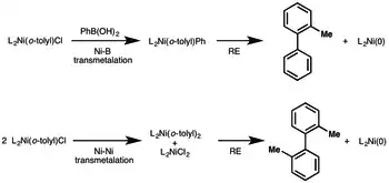 The formation of organonickel compounds in this type of reaction is not always obvious but in a carefully designed experiment two such intermediates are formed quantitatively:[11][12]