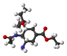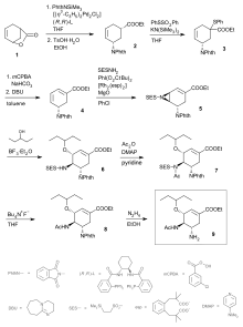Oseltamivir total synthesis concerns the total synthesis of the antiinfluenza drug oseltamivir[1] marketed by Hoffmann-La Roche under the trade name Tamiflu. Its commercial production starts from the biomolecule shikimic acid harvested from Chinese star anise and from recombinant E. coli.[2][3] Control of stereochemistry is important: the molecule has three stereocenters and the sought-after isomer is only 1 of 8 stereoisomers.