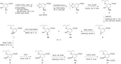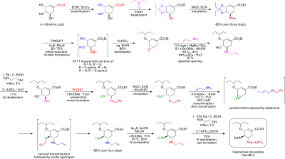 The current production method is based on the first scalable synthesis developed by Gilead Sciences[4] starting from naturally occurring quinic acid or shikimic acid. Due to lower yields and the extra steps required (because of the additional dehydration), the quinic acid route was dropped in favour of the one based on shikimic acid, which received further improvements by Hoffmann-La Roche.[5][6] The current industrial synthesis is summarised below: