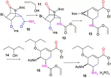 Pyridine (1) is reduced with sodium borohydride in presence of benzyl chloroformate to the Cbz protected dihydropyridine 2. The asymmetric Diels-Alder reaction with acrolein 3 is carried out with the McMillan catalyst to the aldehyde 4 as the endo isomer which is oxidized to the carboxylic acid 5 with sodium chlorite, monopotassium phosphate and 2-methyl-2-butene. Addition of bromine gives halolactonization product 6 and after replacement of the Cbz protective group by a BOC protective group in 7 (hydrogenolysis in the presence of di-tert-butyl dicarbonate) a carbonyl group is introduced in intermediate 8 by catalytic ruthenium(IV) oxide and sacrificial catalyst sodium periodate. Addition of ammonia cleaves the ester group to form amide 9 the alcohol group of which is mesylated to compound 10. In the next step iodobenzene diacetate is added, converting the amide in a Hofmann rearrangement to the allyl carbamate 12 after capturing the intermediate isocyanate with allyl alcohol 11. On addition of sodium ethoxide in ethanol three reactions take place simultaneously: cleavage of the amide to form new an ethyl ester group, displacement of the mesyl group by newly formed BOC protected amine to an aziridine group and an elimination reaction forming the alkene group in 13 with liberation of HBr. In the final two steps the aziridine ring is opened by 3-pentanol 14 and boron trifluoride to aminoether 15 with the BOC group replaced by an acyl group and on removal of the other amine protecting group (Pd/C, Ph3P, and 1,3-dimethylbarbituric acid in ethanol) and addition of phosphoric acid oseltamivir 16 is obtained.