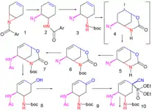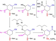 The current production method includes two reaction steps with potentially hazardous azides. A reported azide-free Roche synthesis of tamiflu is summarised graphically below:[7]