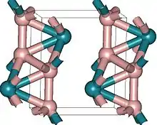 Osmium borides are notable for their potentially high hardness. It is thought that a combination of high electron density of osmium with the strength of boron-osmium covalent bonds will make osmium borides superhard materials, however this has not been demonstrated yet. For example, OsB2 is hard (hardness comparable to that of sapphire), but not superhard.[37] These borides are produced in vacuum or inert atmosphere to prevent formation of osmium tetroxide, which is a hazardous compound. Synthesis occurs at high temperatures (~1000 °C) from a mixture of MgB2 and OsCl3.[37] Three osmium borides are known: OsB, Os2B3 and OsB2. The first two have hexagonal structure,[38] similar to that of rhenium diboride. Osmium diboride was first also sought as hexagonal,[39] but one of its phases was later reassigned to orthorhombic.[37][40] In recent methods of synthesis, it has also been found that a hexagonal phase of OsB2 exists with a similar structure to ReB2.[41]