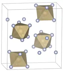 Osmium hexafluoride is one of the 17 known binary hexafluorides, which can be made by the direct reaction of osmium metal exposed to an excess of elemental fluorine gas at 300 °C. It is a yellow crystalline solid that melts at 33.4 °C and boils at 47.5 °C.[24] The solid structure measured at −140 °C is orthorhombic space group Pnma. Lattice parameters are a = 9.387 Å, b = 8.543 Å, and c = 4.944 Å. There are four formula units (in this case, discrete molecules) per unit cell, giving a density of 5.09 g·cm−3.[25] The OsF6 molecule itself (the form important for the liquid or gas phase) has octahedral molecular geometry, which has point group (Oh). The Os–F bond length is 1.827 Å.[25] Partial hydrolysis of OsF6 produces OsOF4.[26] Osmium pentafluoride is a tetramer in the solid state that can be prepared by reduction of osmium hexafluoride with iodine as a solution in iodine pentafluoride:[27]